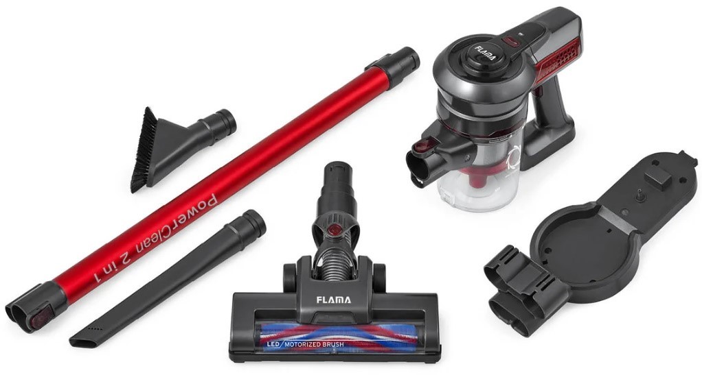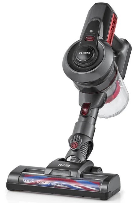 O aspirador vertical 2 em 1, 1642FL tem uma bateria de 22.2V, escova motorizada com iluminação Led, 35 de autonomia de aspiração e uma potência máxima de 120W. Inclui também suporte de parede, ponteira longa e escova para sofás.